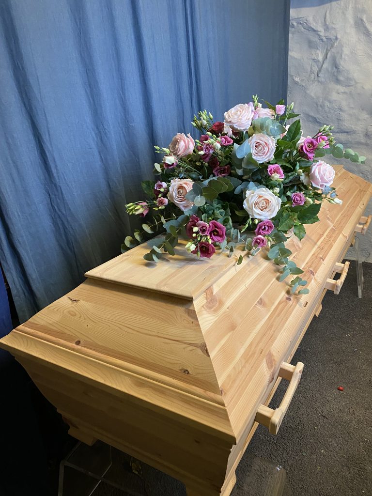 Bilden visar ett exempel på en kistdekoration med vackra sommarblommor. Kistdekorationen görs i samma stil och känsla men blommorna kommer att variera.