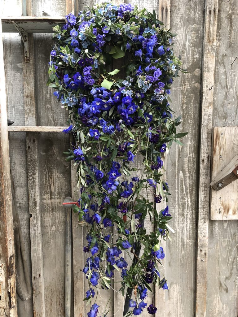Denna krans med fall visas med vår vackra barkurna Ocean blue, handmålad av oss på IGNIS Blommor i miljövänliga färger och helt nedbrytningsbar – helt enkelt lånad från naturen.