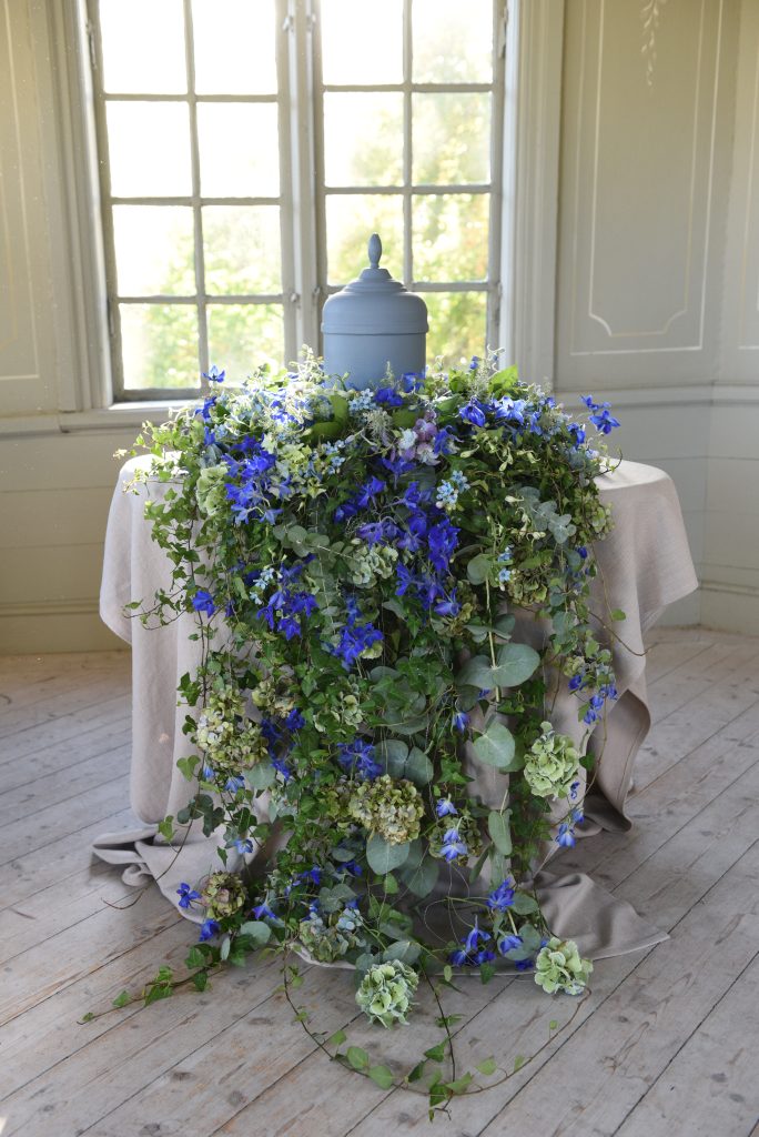I kollektionen Himmelskt blå finns kist- och urndekoration, krans, dekoration, ankare, hjärtan och ljusdekoration. Blommor ur samma kollektion ger ceremonin en samstämmig och harmonisk känsla.