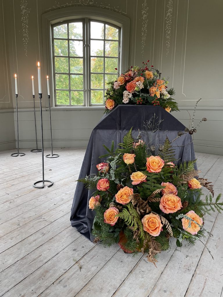 I kollektionen Skogsglänta finns kist- och urndekoration, kransar, dekorationer, bukett, hjärtan, handbukett, ankare och ljusdekoration. Blommor ur samma kollektion ger ceremonin en samstämmig och harmonisk känsla.
